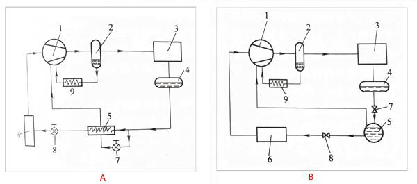 對于一次節(jié)流系統(tǒng)(下圖中的A所示),來自貯液器4的制冷劑液體分為兩路,主要的一路從經(jīng)濟器5中的盤管內(nèi)流過,放出熱量而過冷,然后經(jīng)節(jié)流閥8節(jié)流后,進入蒸發(fā)器6中制冷;另一路經(jīng)過節(jié)流閥7降壓后,進入經(jīng)濟器5中吸熱而產(chǎn)生閃發(fā)性氣體,經(jīng)過螺桿式壓縮機機體上的中間補氣口,進入到正處在壓縮初始階段的基元容積中,與來自蒸發(fā)器的氣體混合繼續(xù)被壓縮。