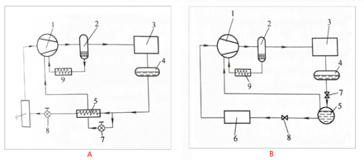 帶有經(jīng)濟(jì)器的螺桿式冷水機(jī)的制冷系統(tǒng)有一次節(jié)流和二次節(jié)流兩種形式,如下圖所示:對(duì)于一次節(jié)流系統(tǒng)(下圖中的A所示),來(lái)自貯液器4的制冷劑液體分為兩路,主要的一路從經(jīng)濟(jì)器5中的盤(pán)管內(nèi)流過(guò),放出熱量而過(guò)冷,然后經(jīng)節(jié)流閥8節(jié)流后,進(jìn)入蒸發(fā)器6中制冷;另一路經(jīng)過(guò)節(jié)流閥7降壓后,進(jìn)入經(jīng)濟(jì)器5中吸熱而產(chǎn)生閃發(fā)性氣體,經(jīng)過(guò)螺桿式壓縮機(jī)機(jī)體上的中間補(bǔ)氣口,進(jìn)入到正處在壓縮初始階段的基元容積中,與來(lái)自蒸發(fā)器的氣體混合繼續(xù)被壓縮。