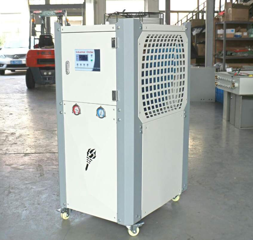 風冷式模具冷水機,機身內含有保溫水箱和水泵,無需再另加冷卻水塔來散熱。安裝和移動方便。但對工作環境要求較高,首先,因為它是以熱風循環來制冷的,所以,如果安裝車間的通風效果不好的話,會直接影響到冷水機的制冷效果。不能放在有濕度要求的無塵車間。因為風冷式模具冷水機,會在機頂噴出水蒸氣來散熱。